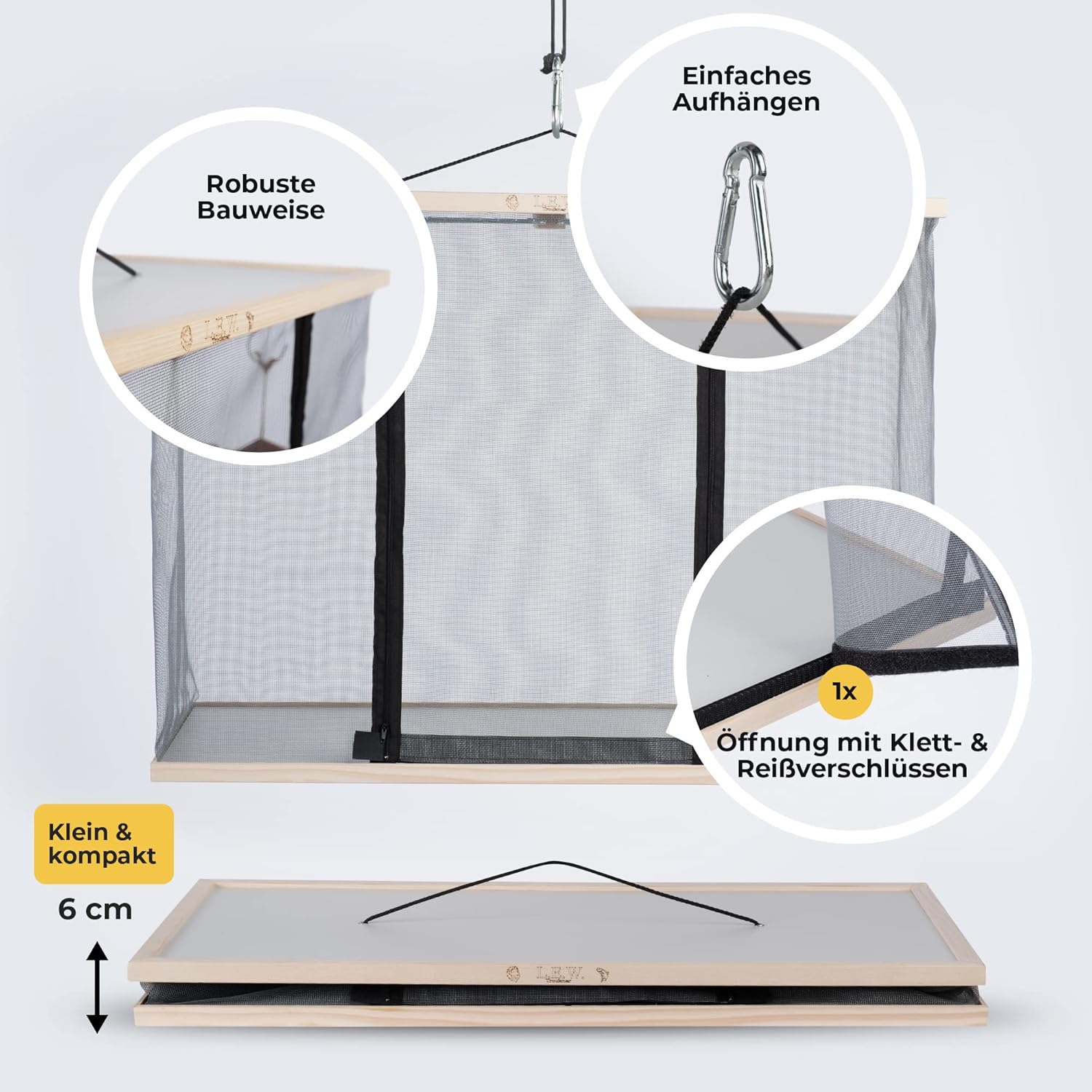 Die hochwertige Reifekammer von L.E.W. ist ideal zum Trocknen und Reifen von Fleisch, Fisch, Wurst oder Käse. Perfekt für die Herstellung von Jerky, Salami, Schinken oder Lachs – ganz ohne Strom, Zusatzstoffe oder Chemie. Das feinmaschige Fiberglasnetz schützt vor Insekten, sorgt für hygienische Luftzirkulation und der robuste Kiefernholzrahmen garantiert lange Haltbarkeit. Praktisch: Zusammenklappbar und platzsparend verstaubar!