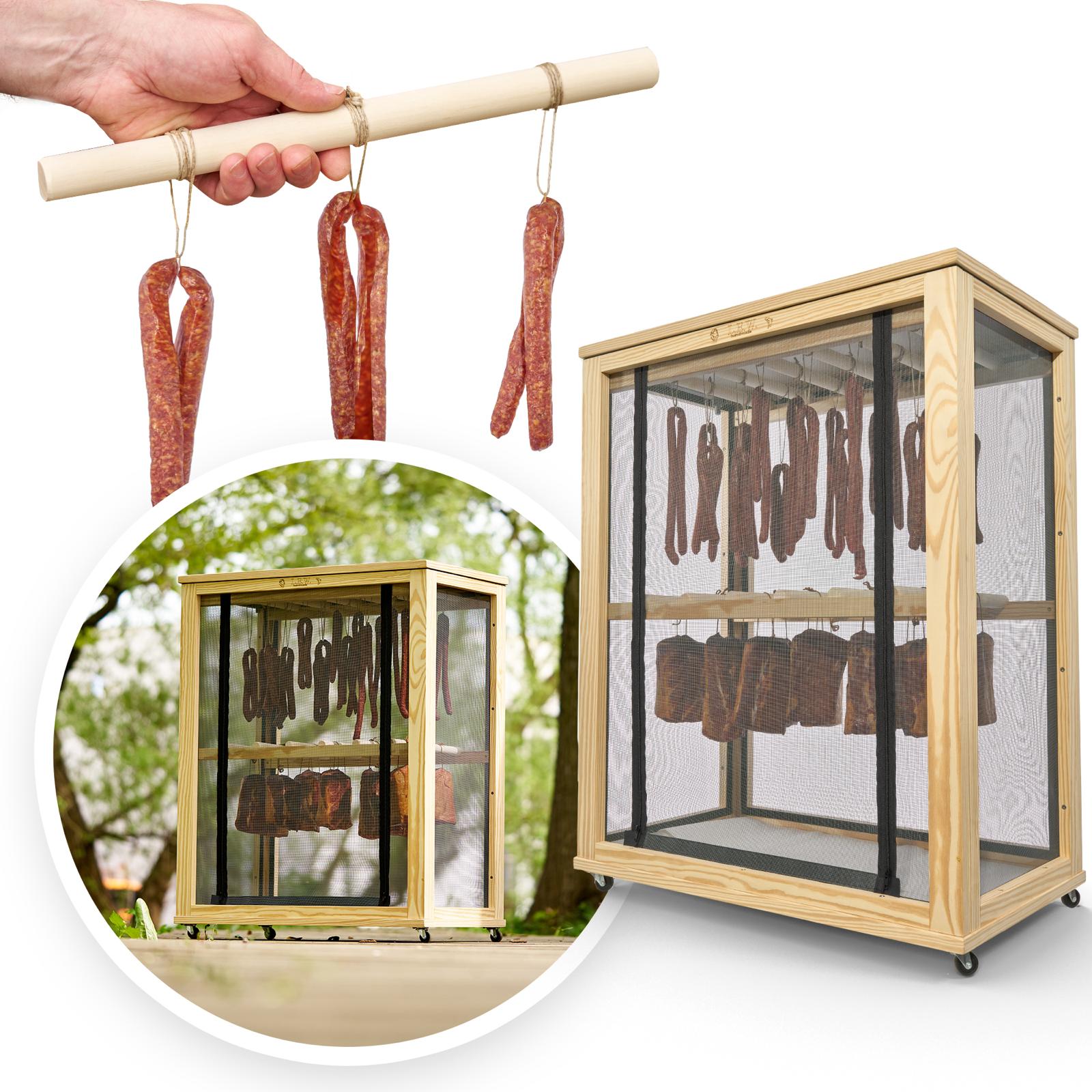 Die robuste Reifekammer von L.E.W. in stehender Ausführung eignet sich ideal zum Lufttrocknen und Reifen von Fleisch, Fisch, Wurst oder Käse. Perfekt für die Herstellung von Jerky, Salami, Schinken oder Lachs – ganz ohne Strom oder Zusatzstoffe. Das feinmaschige Fiberglasnetz schützt Ihre Lebensmittel zuverlässig vor Insekten und sorgt für optimale Luftzirkulation. Der massive Kiefernholzrahmen steht stabil und ist besonders langlebig.